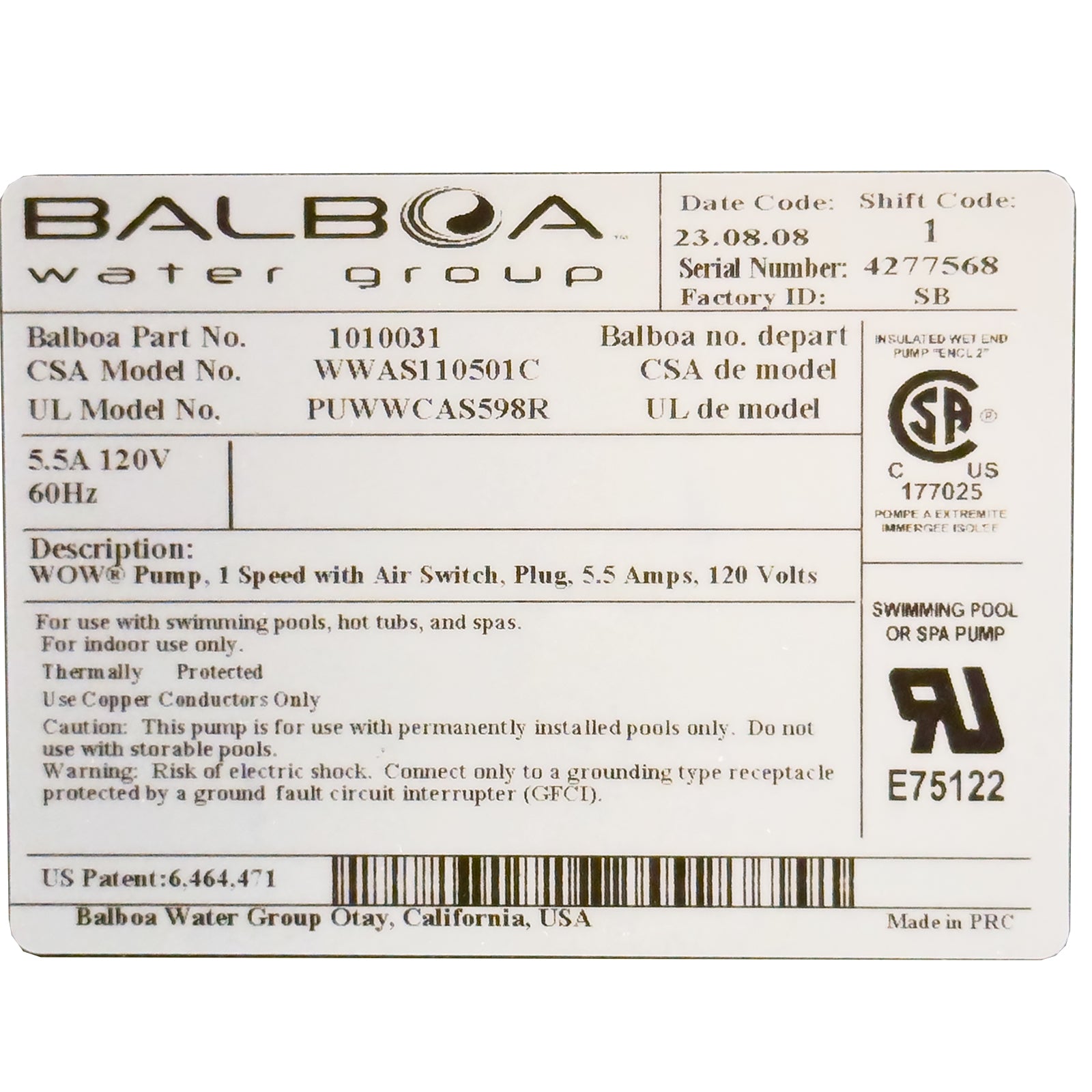 Pump, HQ Bes-6000, 0.5Hp, 115V, 1-Spd