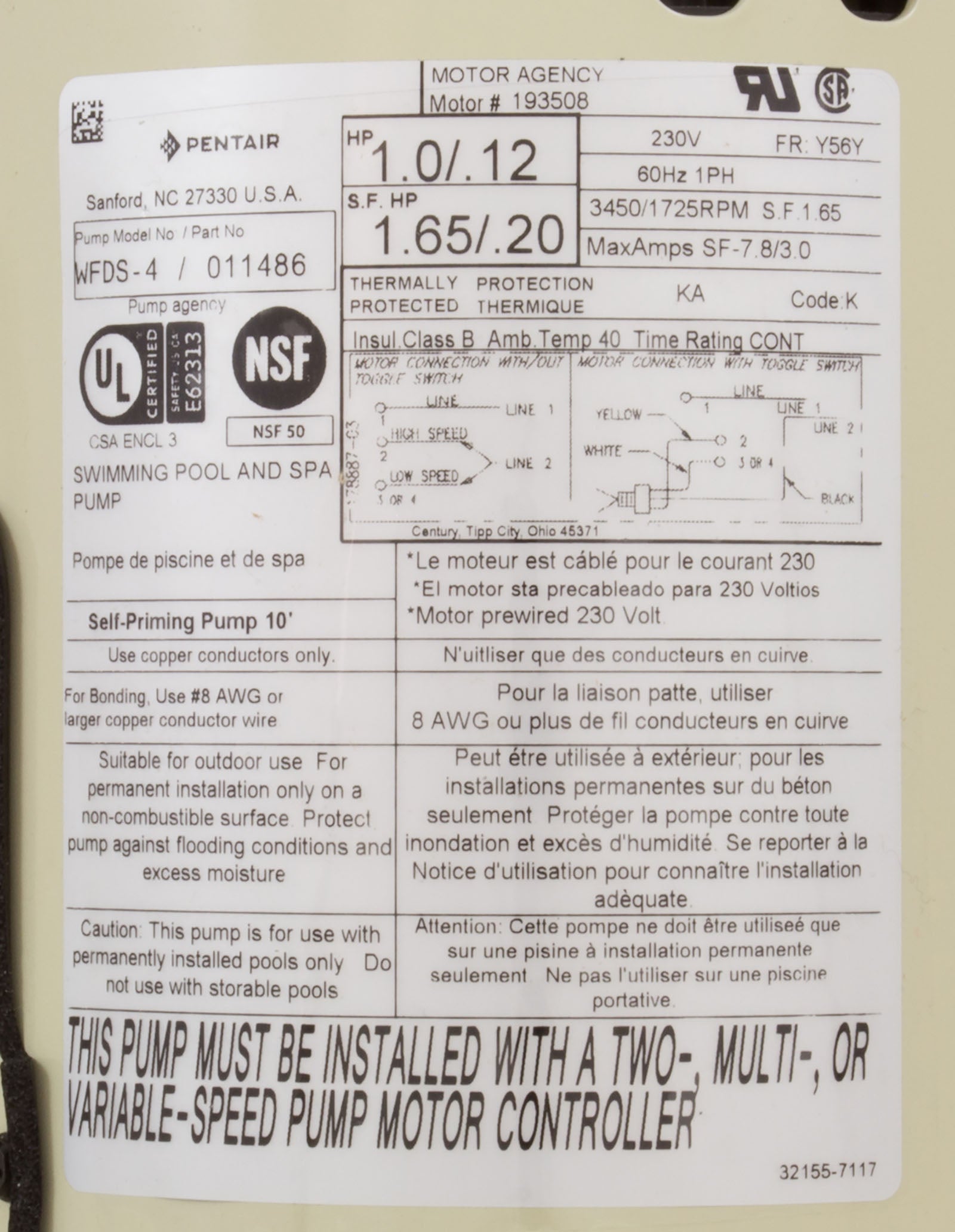Pump, Whisperflo, 230V, 1Hp, 2 Spd, w/ Switch